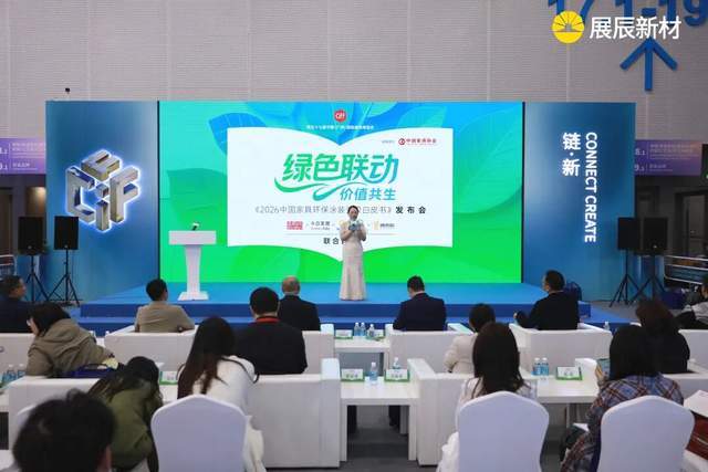 2026年3月20日,春分时节,羊城广州,万物并秀。第五十七届中国(广州)国际家具博览会论坛区内,一场聚焦家具产业绿色未来的行业盛会如期举行。在中国家具协会的指导下,展辰新材携手中国家具行业第一本全国中文核心期刊《家具与室内装饰》杂志、全球家居业商业指南《今日家居》、全球最大的空间设计平台酷家乐以及家居产学研基地博木院,共同编制并发布了《2026中国家具环保涂装升级白皮书》。